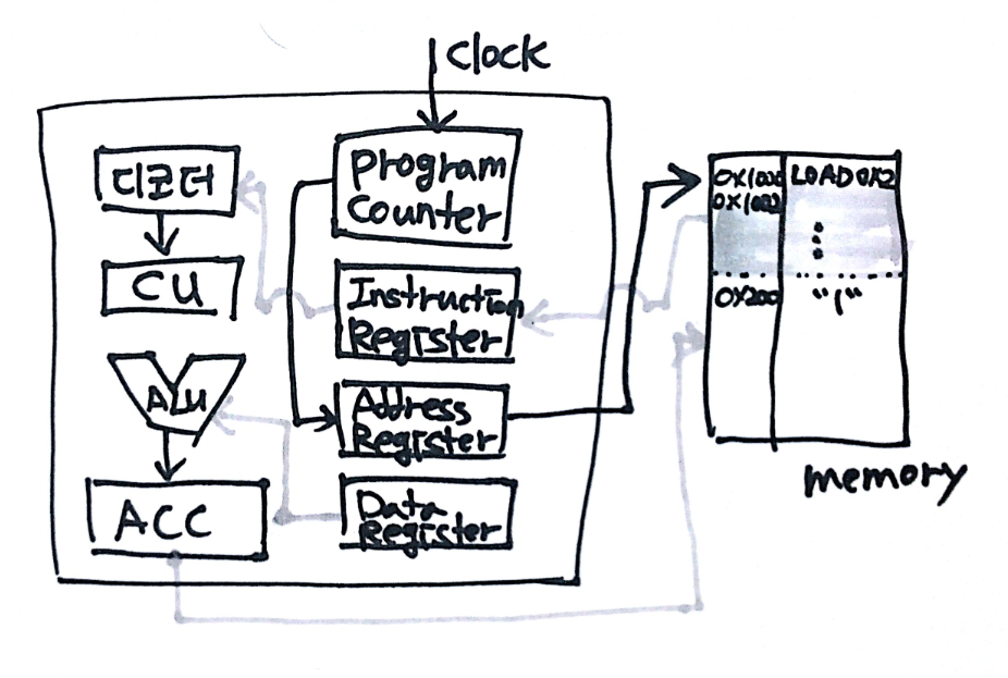 - Central Unit(CU) : 디코더에서 해석된 명령어의 신호를 받아 주변장치를 제어하는 신호를 만든다.