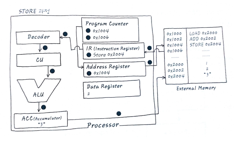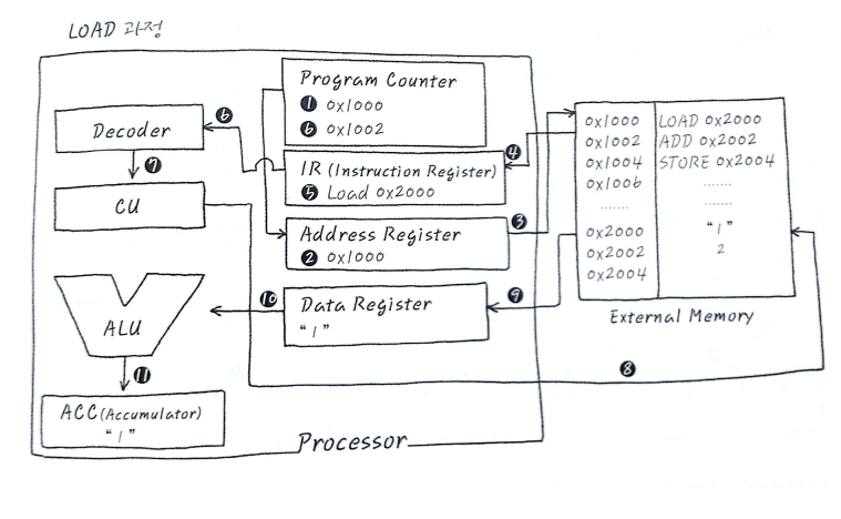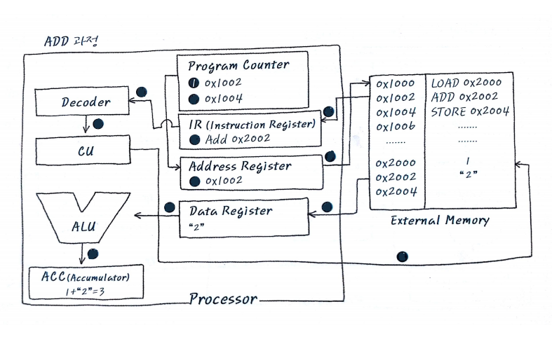 - Instruction Register: PC가 가르치 키는 명령의 주소에서 얻어온 명령어를 가지고 있다.